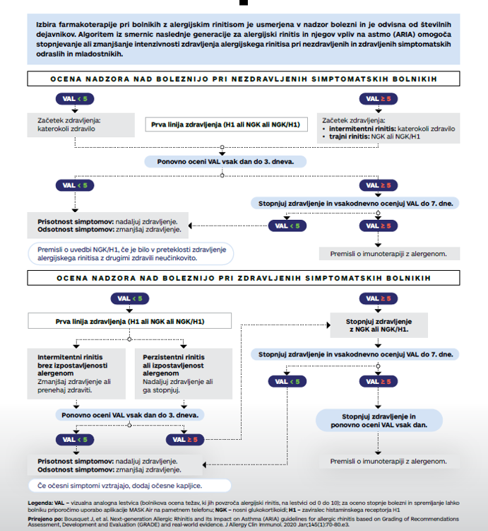 Izbira farmakoterapije pri bolnikih z alergijskim rinitisom je usmerjena v nadzor bolezni in je odvisna od številnih dejavnikov. Algoritem iz smernic naslednje generacije za alergijski rinitis in njegov vpliv na astmo (ARIA) omogoča stopnjevanje ali zmanjšanje intenzivnosti zdravljenja alergijskega rinitisa pri nezdravljenih in zdravljenih simptomatskih odraslih in mladostnikih. Algoritem je recenziral asist. Mark Kačar, dr. med., spec. alergologije in klinične imunologije s Klinike Golnik.